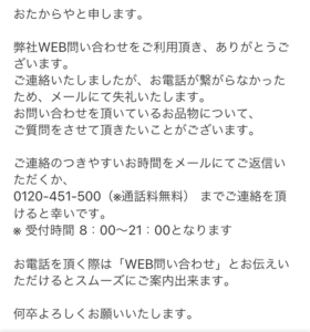 およそ4時間後、メールにて返信がありましたが電話にて回答したいと返答があったので案内されたフリーダイヤルにかけました。